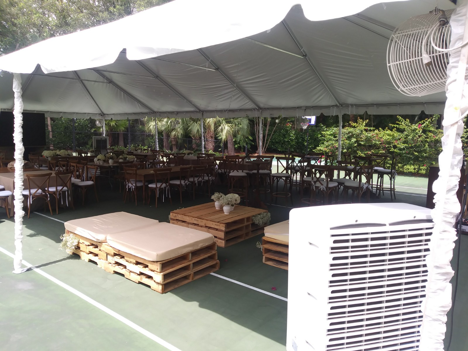 Renting a tent 30 x 60 with Eventgi Party Rentals was a great experience. Everything was delivered on time, all party equipments “Farm Tables, Cross Back Chairs, Rustic Bar, Fans, Linens, tableware, glasses, stage, dance floor, bistro lighting, barstools, cocktail tables” in great shape. The rental process was so easy, they sent a quote quickly, were able to make sure I had enough tables, chairs and space for the desired setup. A++ Experience, I will use them again in the future.